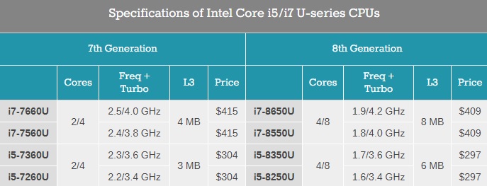 Производитель представил новые модели U-серии Kaby Lake i7 и i5 - i7-8650U, i7-8550U, i5-8350U и i5-8250U - построенные на том же техпроцессе 14нм+ с энергопотреблением до 15Вт для установки в ультратонкие ноутбуки и ноутбуки-трансформеры 2 в 1 для потребителей и малого бизнеса.