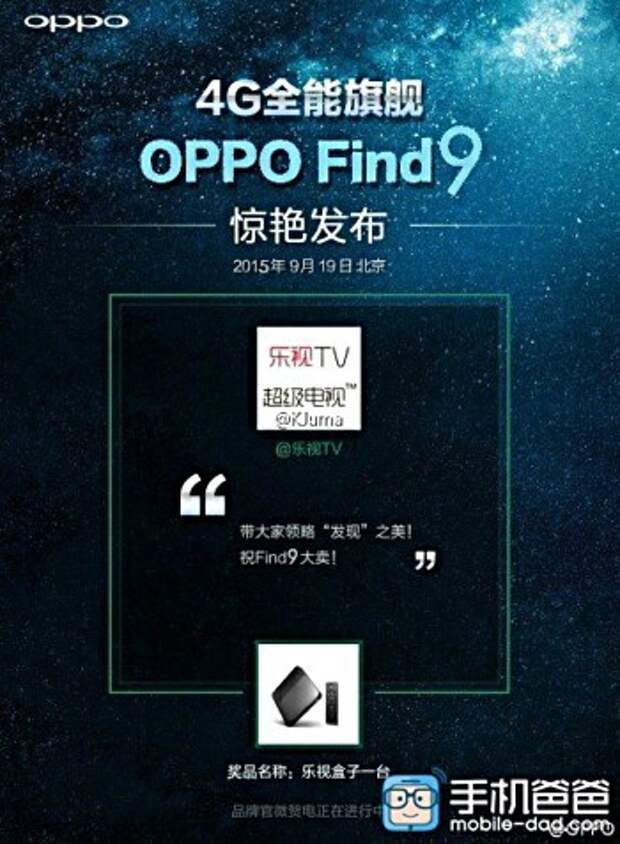Если верить информации от источника @Kjuma в сети Weibo, то запуск нового смартфона Oppo Find 9 состоится 19 сентября. Данный человек в подтверждении этой информации показал соответствующее тизер-изображение.