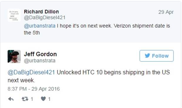 Один из старших менеджеров HTC Джефф Гордон посредством Твиттера ответил на сообщение одного из пользователей, рассказав, что отгрузки разблокированных HTC 10 в США начнутся в первую неделю мая.