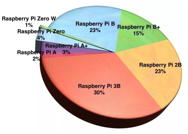 Таким образом компьютеры Pi расположились на третье строчке среди самых продаваемых 'универсальных вычислительных машин' позади компьютеров Apple Macintosh и Microsoft Windows.Также была представлена круговая диаграмма различных версий Pi: