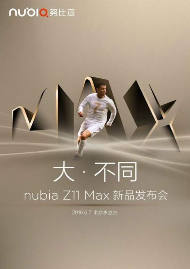 Новое тизер-изображение с новоиспеченным лицом бренда Криштиану Роналду представляет информацию об анонсе смартфона Nubia Z11 Max, который состоится 7 июня 2016 года. Мероприятие пройдет в Пекинском национальном плавательном комплексе, известным также как Водяной Куб.